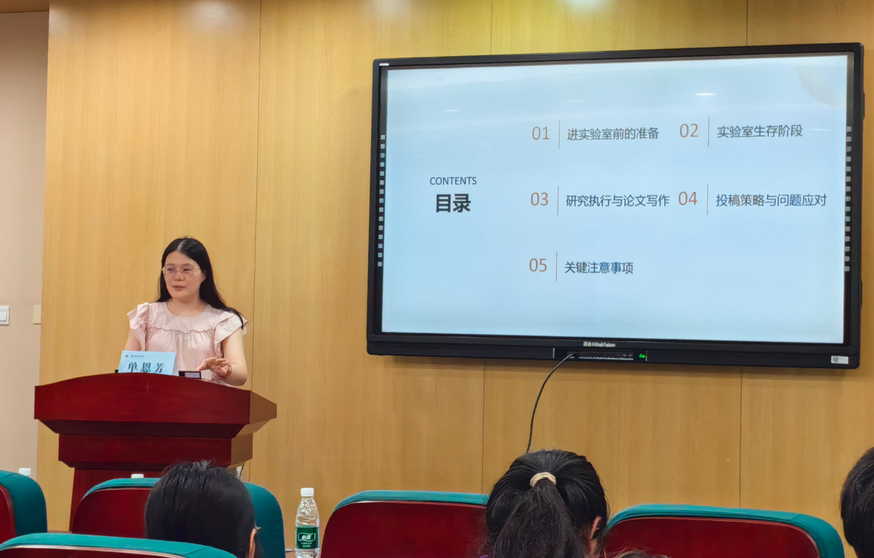 在优秀学长学姐分享环节,王柳丹、徐婷分别以本科生、博士生身份分享科研经历,针对新生在科研起步阶段的困惑提供建议,鼓励学弟学妹们以积极心态面对挑战,在实践中积累经验。